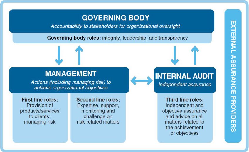 IIA har tagit fram en modell, The Three Lines Model, för att hjälpa organisationer att identifiera strukturer och processer som på ett bra sätt kan stödja verksamheten att uppnå målen och tillhandahålla stark intern ledning och styrning samt riskhantering. Modellen visualiseras i nedanstående bild.